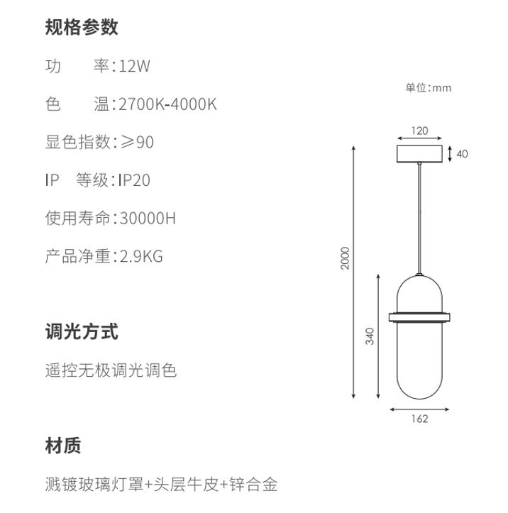 美时吊灯灵感源自早晨的光线,,,,穿透云雾渺渺的大气层洒到地上。。。。美时外层的玻璃自上而下从深色到透明的渐变镀层还原了这一情境,,光透过双层玻璃形成丰富的折射效果,,,,一如破晓时的光线充满朝气,,,采用上下两路光组合,,下路光直出提供主要光线,,,,上路光提供氛围光。。。上路光在手工吹制玻璃的不规则壁厚折射下,,,呈现了极其丰富的变化,,,,采用头层牛皮作为一个点缀,,,,缓冲了玻璃与金属带来的冰冷和生硬的感觉,,,,取得了视觉的平衡。。。
