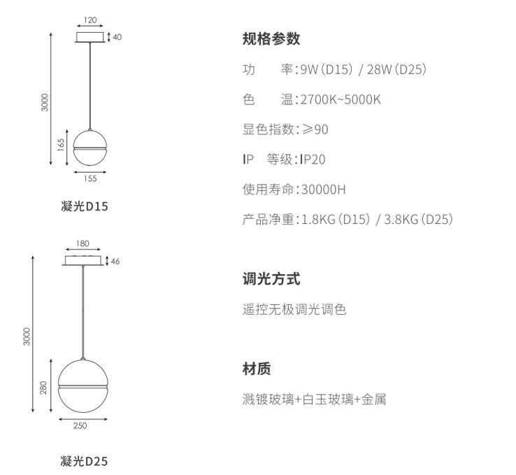 凝光吊灯用双层弯曲的造型作为主要造型特征形成在空间里自由灵动的造型,,以一定的角度倾斜,,,,形成丰富的画面,,,半圆形等分的灯罩采用白玉料与透明溅镀两种工艺,,下路利用直下式光学提供充足光线,,,上路则采用测发光方式,,,发光面透过溅镀的玻璃曲面折射出一个光的倒影。。两种方式组合在一起,,使其在简单的几何形态中有自己的表达。。。